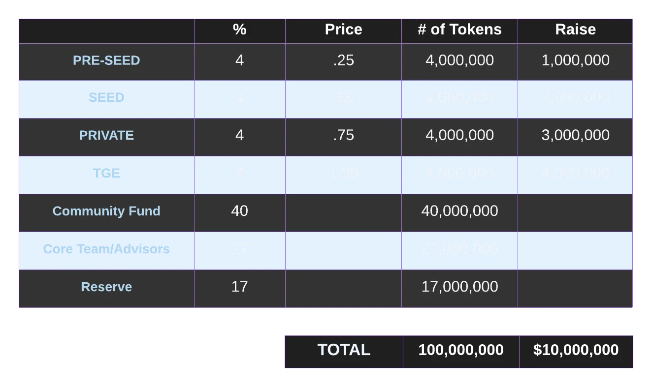 the following round schedule shows token allocations and price the following schedule represents our $cth token allocation to the traditional stakeholders early investment this includes pre seed, seed & private rounds tge token generation event this is the public sale of tokens on an exchange community fund core team & advisors this is the founder development team + our advisors reserve game development & content creation marketing & promotions rewards for additional partners & other development team members special rewards for community participation, referrals & influencers